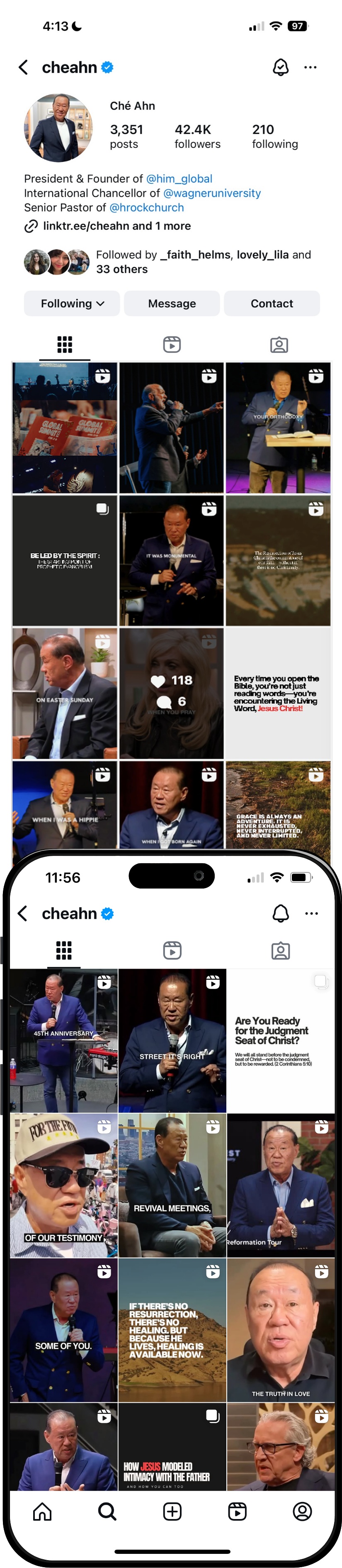 A global apostolic leader, revivalist, and voice for reformation. His message centers on the power of the Holy Spirit, revival culture, religious freedom, and the Kingdom of God advancing in every sphere of society. His social content should reflect spiritual authority, prophetic vision, and a call to action that mobilizes believers for transformation. Ché Ahn Media exists to carry this mantle further — imparting the heart and message God has placed in him to believers across the globe. With a commitment to spiritual authority and prophetic clarity, the ministry aims to be a transformative influence in both Christian and mainstream media, ushering the power of the Holy Spirit into every space it touches.